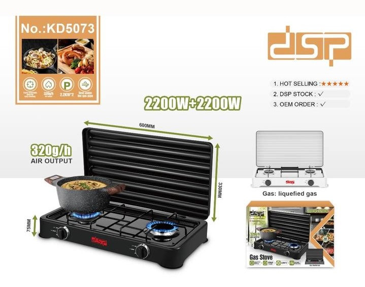 گاز دو شعله دی اس پی مدل 5073 دستگیره کنترل آتش مشعل مهر و موم شده قدرت: 2.2KW+2.2KW خروجی هوا: 320 گرم در ساعت گاز: گاز مایع